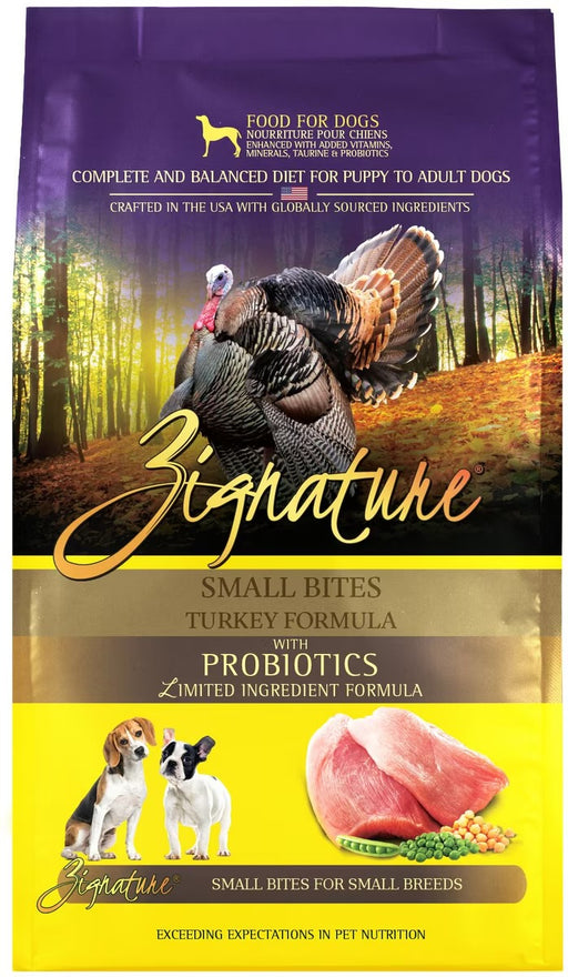 ZIGNATUREFor pint-sized pups, try Zignature Turkey Formula Small Bites Dry Dog Food! This limited-ingredient kibble features smaller bites that are paw-fect...